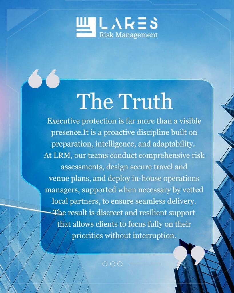 At Lares Risk Management International (LRM), executive protection is a strategic service, blending discretion with resilience and always tailored to each client’s unique needs.